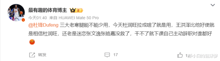 有博主也认为杜锋的用人很有问题,三个老将实际上应该少用,杜润旺状态不佳还硬用,王洪泽明显比杜润旺好使,而且痴迷用张文逸、张皓嘉。